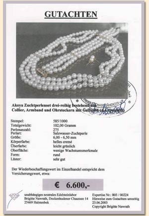 Die ca. 6 mm großen Akoya-Salzwasserzuchtperlen sind dreireihig