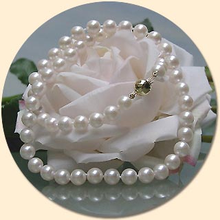 Einfach wunderbar. Ein weißes Akoya-Perlencollier mit fast vollkommen runden Perlen (7,0-7,5 mm) und einer leichten Überfarbe in rosé. Das Collier (AA Qualität) ist ca. 45 cm lang und hat einen wunderschönen Kugelverschluss aus 585er Gelbgold.