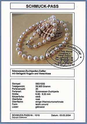 von Gold und Perlen. Das Collier ist 45 cm lang, die ca. 7,5 mm