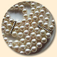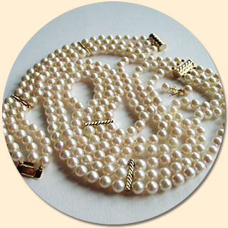 Die ca. 6 mm großen Akoya-Salzwasserzuchtperlen sind dreireihig nebeneinander auf Seide geknotet und mit 585er Gelbgoldstegen miteinander verbunden.